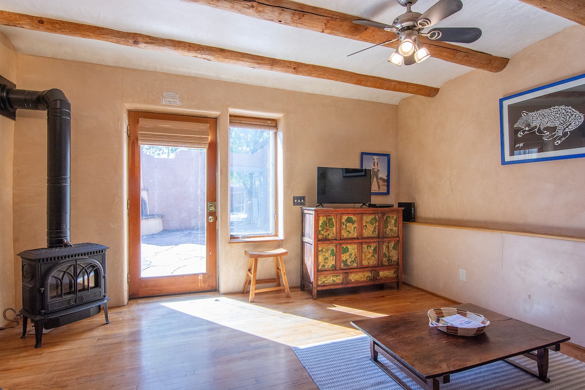 🌜H I D E A W A Y N O R T E: an inspiring & cozy adobe for your high desert adventure 🌵EASY 3 MINUTE WALK to Santa Fe's best restaurants, bars, coffee shops, boutiques, movie theaters, farmers and artisan markets. 🌵Train direct from ABQ + skip the rental car 🌵King + Queen beds 🌵Fast ⚡️ WIFI 🌵Fireplace + AC/heat minisplits 🌵Bonus Sunroom w/couch and TV 🌵Private patio 🌵Full Laundry 🌵KIDS: Pack n’ Play, high chair/booster, toys, books, white noise 🌵DOGS: beds, bowls, gated patio