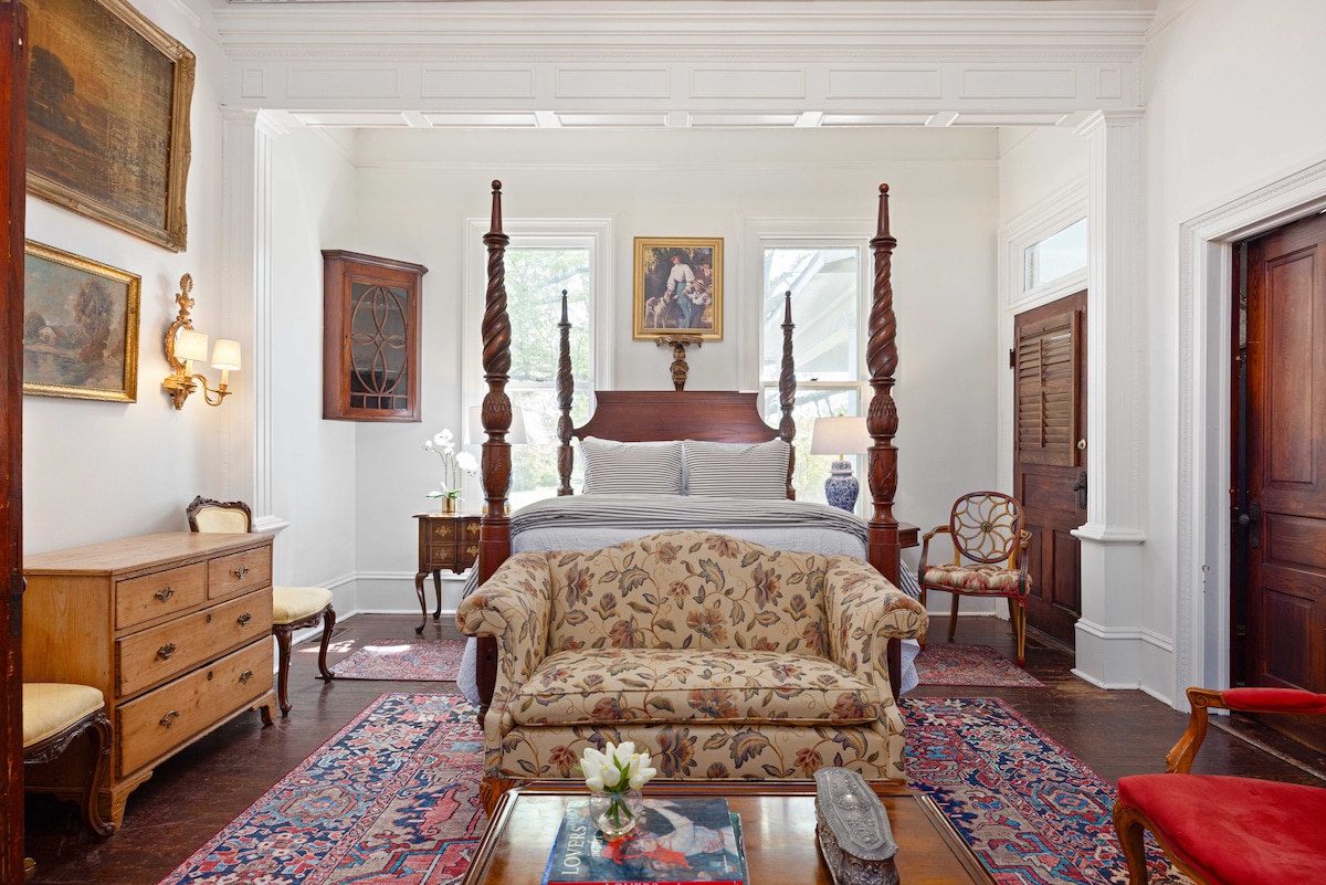 The Stevens Room offers ground-floor accommodation in the Town House Inn. Featuring an elegant queen-sized four-poster bed, sitting area and large windows, this room provides generous space and comfort for singles or couples. The large en-suite bathroom features a double-sink vanity alongside a spacious standing shower. Self-service coffee and tea available in the hospitality landing, up the stairs just outside the room.