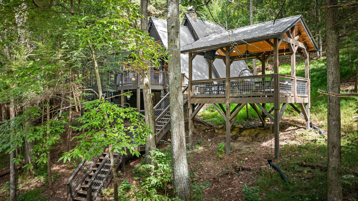 Escape to our renovated cabin with a modern kitchen and spa-like bathrooms, perfect for relaxation. Enjoy creekside fishing and kayaking (kayaks provided) or unwind by the screened-in porch fireplace. Nestled in privacy beside the soothing sounds of a rushing waterfall in the creek, it’s the perfect place for creating cherished memories! "Beautiful spot. Great house. Will definitely stay again!"~Jamie, November 2024