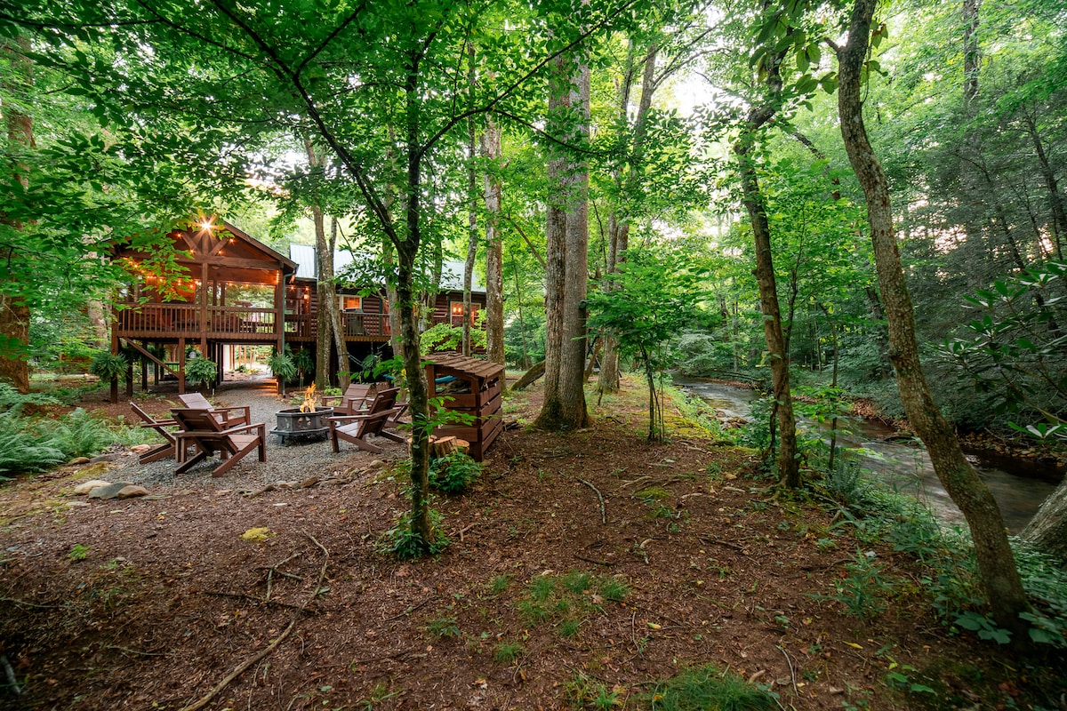 Our secluded creekside cabin is tucked away on a trout preserve in Dahlonega’s national forest, surrounded on all sides by nature & water! We have a natural swimming hole with a constant running flow of mountain spring water (it gets its blue tint from the spring minerals). Enjoy hiking, fishing, hunting, gold panning, and exploring the extensive forest service roads! Multiple small waterfalls 30 ft from the house. Pool table, Firepit, Outdoor kitchen, Hammocks. Sleeps 14!