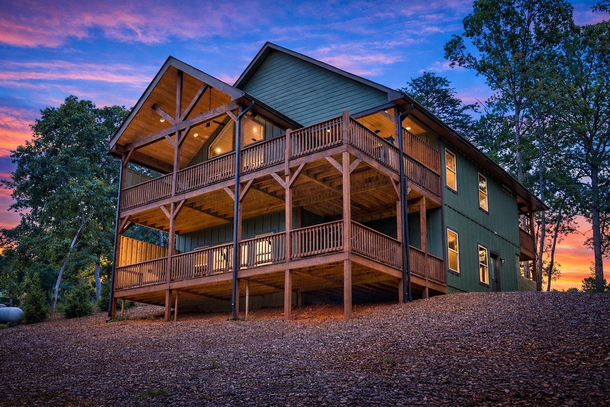 • New 3,300 sqft Luxury Cabin-Chic home in North Georgia • Location! 12 mins from downtown Blue Ridge & 7 from McCaysville! • Easy access to Mercier Orchards • 3 bedrooms (2 King) PLUS Bonus Sleeping/Game Room (sleeps 11 max); 3½ baths • 2 decks. Hot tub, gas grill • Cathedral ceilings with large windows • Fast Wifi (200mbs) • 3 fireplaces (1 gas inside on each floor, 1 outside on deck) & fire pit • 7 Flat Screen HDTVs • Game room with Arcade, Ping-Pong Table, & 65” TV • Wet Bar w/ fridge & sink