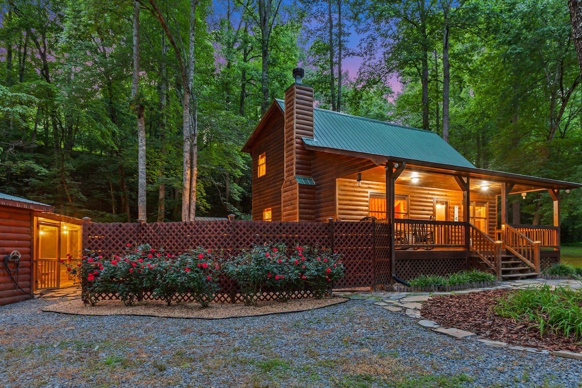 EASY WINTER ACCESS!! Imagine your stress being whisked away the moment you leave your car by the sounds of the creek below the cabin. Enjoy it from the treehouse with outside fireplace, or down by the creek at the firepit or on the screened back porch. Cabin has smart TV's, WIFI, cable, luxury linens and towels. Two master suites welcome you to a peaceful slumber. Many nearby wineries, waterfalls, a beautiful train ride, trout fishing, river tubing, or visit the many apple orchards in the area.