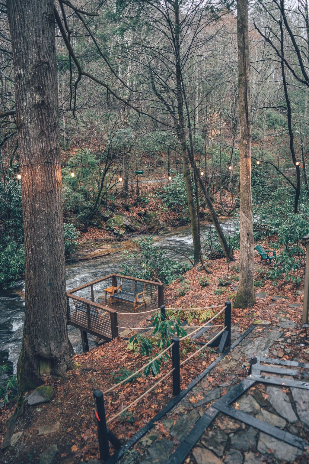 Creekside A-frame Treehouse in nature tucked amongst the trees in the scenic mountain town of Blue Ridge, Georgia. This treehouse is tiny home perfect for nature lovers, couples or solo adventurers. Inside this tiny cabin you will find custom construction with reclaimed wood from a 100 year old furniture store with rustic and modern charm. Outside, you will be greeted by the babbling of Fightingtown Creek, a large sunken hot tub overlooking the creek and a firepit under a canopy of stars.