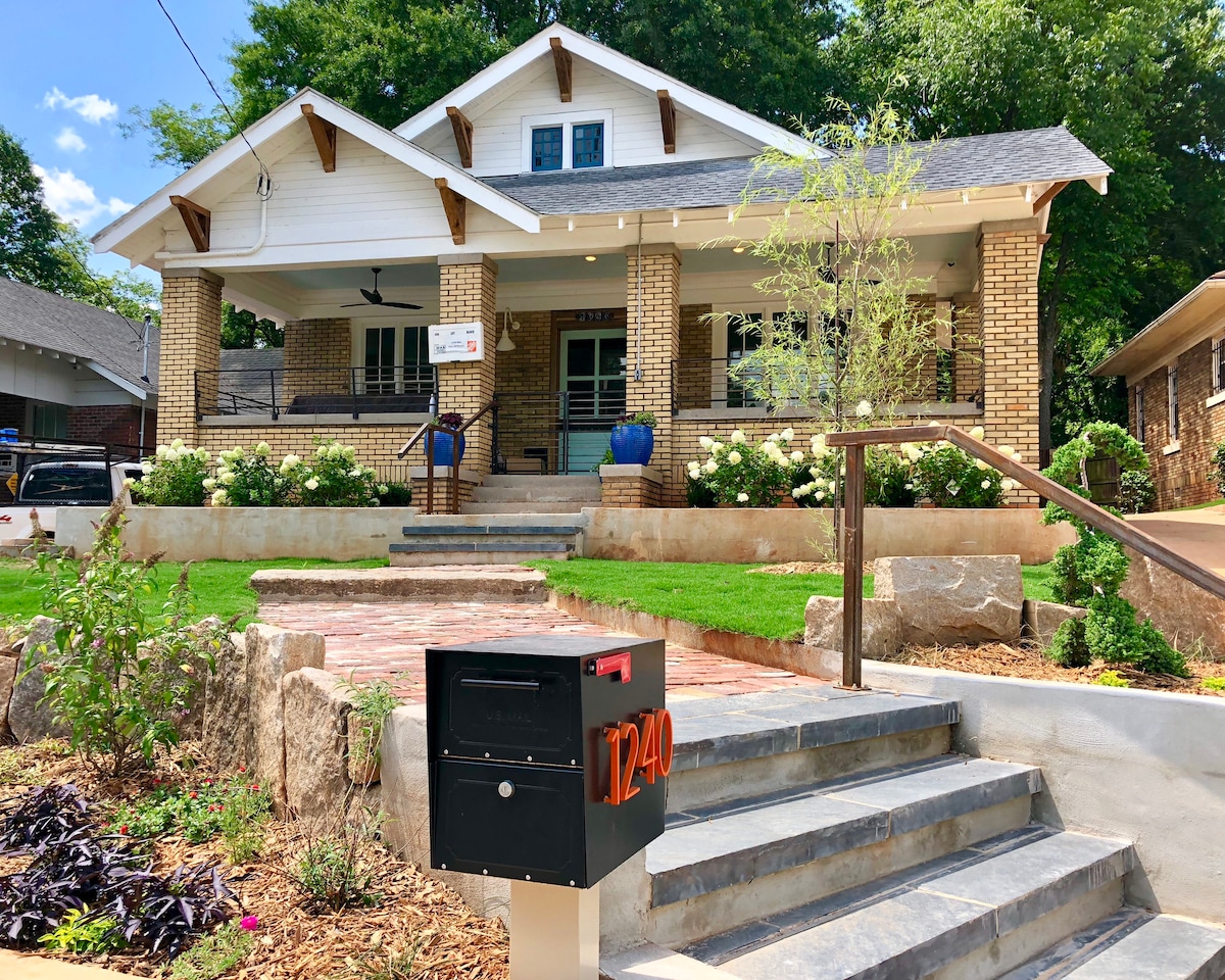 Charming and Unique renovation of 1920's craftsman historic bungalow in West End, perfect if traveling for work & near downtown, AmericasMart, Georgia World Congress Ctr, the Stadium, etc. Huge furnished porch/seating deck with firepit/grill. Gorgeous designer kitchen. Custom steel/reclaimed wood finishings throughout entire home! Luxurious king/queen beds. Dual shower. Premium cable/internet/security system. Books galore! Washer/dryer. Essentials provided! Pets welcome with advance notice/fee.