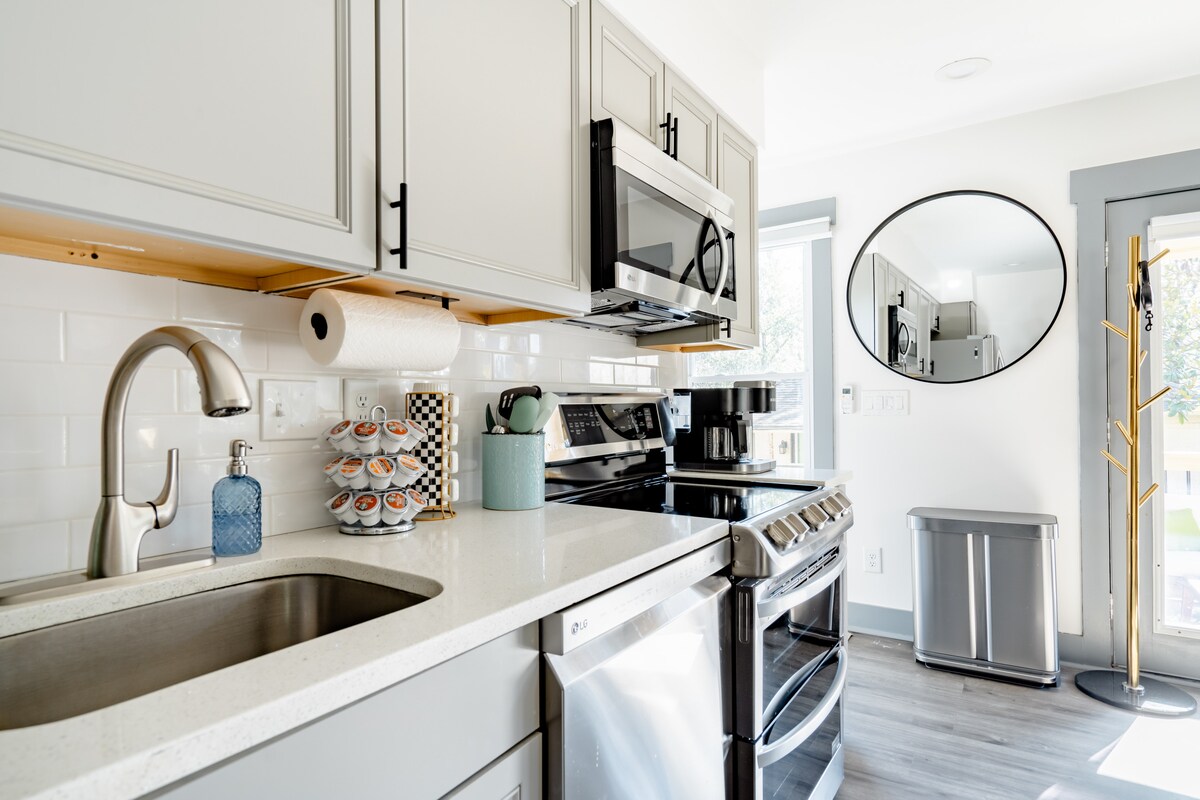 The historic Monroe House was built in 1920, recently upgraded with more refined finishes. The Monroe House’s 1st floor Airbnb apartment offers luxurious King and Queen size beds, a fully stocked kitchen, full laundry, gig speed wifi with room to entertain. The back area provides two private parking spaces—walking distance to Ponce City Market, Whole Foods, Trader Joe's, and Piedmont Park. The Airbnb is the convenient 1st floor apartment of a duplex. It is child friendly and pet friendly.