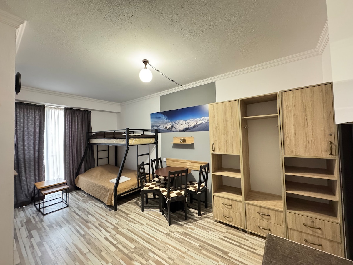 Well decorated and furnished Studio Hotel apartment with spectacular mountain view from both balcony and large king size bed, so you can enjoy the spectacular view from balcony or from the bed, it is located in the 2nd floor of loft 2 building of Redco Complex in Heart of New Gudauri, right next to Gondola Ski lift. The apartment has unique design, stunning mountain view from balcony. The apartment has super great location in the centre for those who like Skiing & other snow and mountain sports.