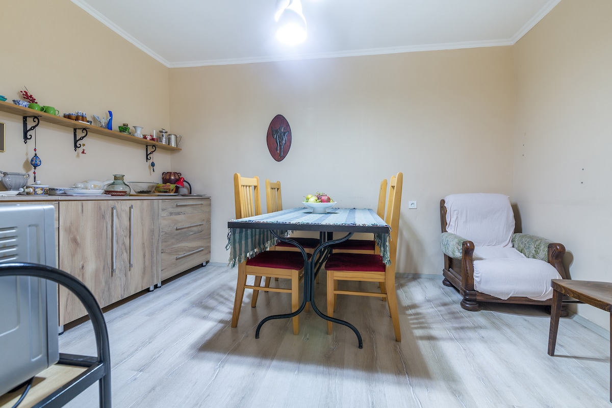 The Apartment is located in a residential area of Vera, close to the vibrant scene of famous Rooms hotel & Stamba. It is nested in an orchard, providing a calm & yet central residence. We are happy to serve you delicious Georgian breakfast with extra charge made fresh at Nana's Kitchen. The apartment has all you need including a well-equipped kitchen & looks into the yard full of fruit trees. This is a perfect space to relax at home or in the garden, after a pleasant day touring Tbilisi.
