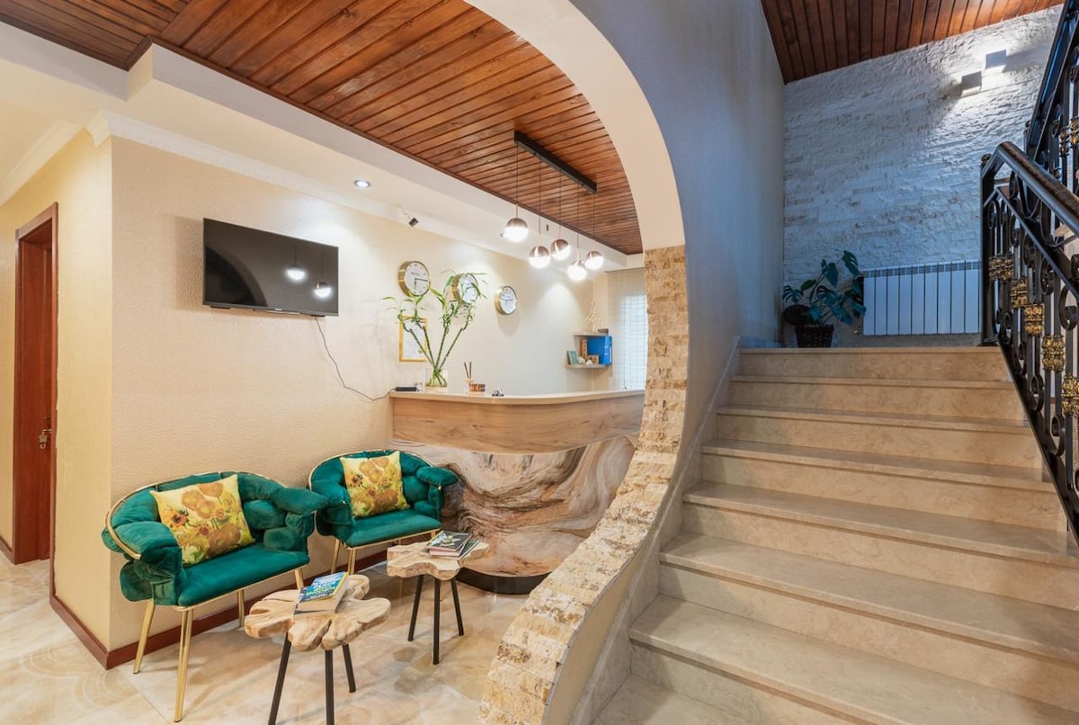 Tskaltubo Epic Hotel and Spa is located 6 km. away from Tskaltubo, in the village of Kvilishori, just at the exit of Prometheus cave. We offer a Large Suite for families or groups of friends with breakfast, pool, jaccuzi and sauna. Georgian restaurant with delicious local dishes, bars, wine museum and wine degustation are on site. This place sets the stage for a memorable trip.