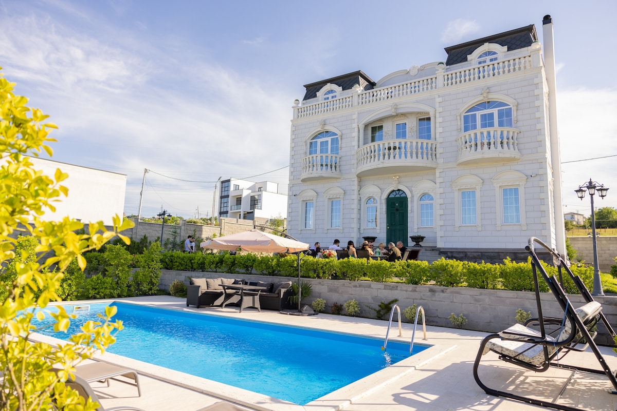 High Class Villa in Shindisi- Tabakhmela Area. only 5 min drive from Mtatsminda park and 10 min drive from the Liberty square -Tbilisi City Centre. Villa is Designed in a Vintage style , with a Baroque elements , French style beds , Unique wine cellar with Fireplace and kitchen . We offer 3 bedrooms with a king size beds , 3 Bedrooms with Quinn beds and 1 bedroom with 2 single beds . out of this 7 Bedroom , 3 VIP Class. 6 of them have AC in the room and own balconies with a Brilliant views