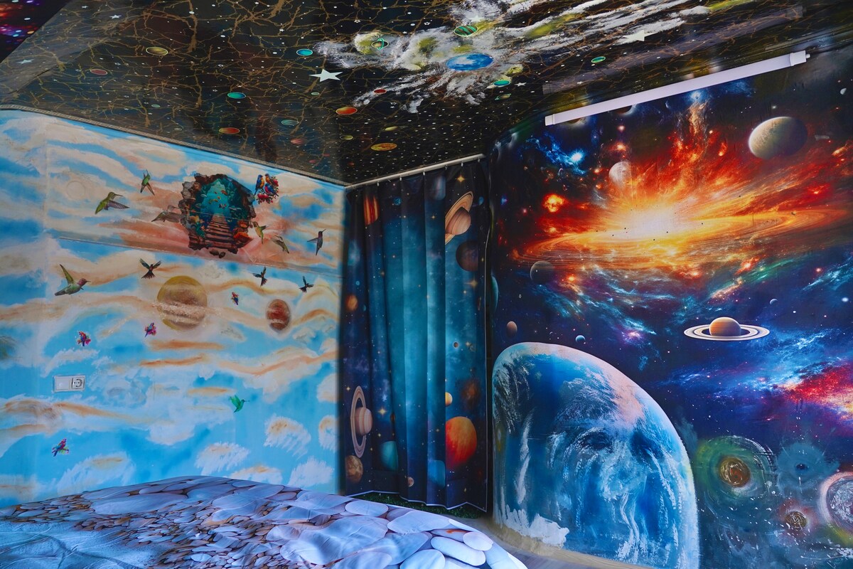 🌌 Cosmic Room – A Unique Stay for 2 Guests Step into another dimension in our Cosmic Room, inspired by the mysteries of space. Located in a wooden house next to Tree House Annunaki 444, this cozy retreat is perfect for couples or solo travelers seeking tranquility and adventure. Enjoy a comfortable bed, private balcony with breathtaking nature views, and a peaceful atmosphere. Relax in the guitar-shaped pool, explore the on-site museum, and immerse yourself in the magic of the Aragvi Valley.