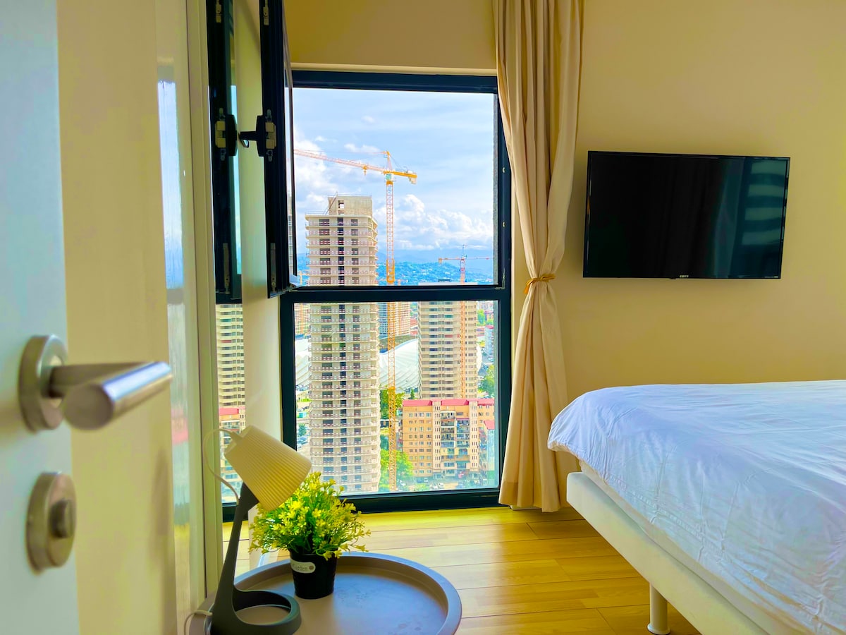 Boho-style studio in the historical center of Batumi — Porta Batumi Tower - Panoramic windows with a breathtaking view of the sea, mountains, and city - Bathtub! - Perfect cleanliness and freshness! - Excellent soundproofing! - Warm floors! - Many elevators that work without delays Nearby: - The Sea, Old Town, Europe Square, boulevard, restaurants and cafes are just 5 minutes away - Supermarkets, pharmacies, casino, hookah bars and bars are nearby - Convenient parking near the house