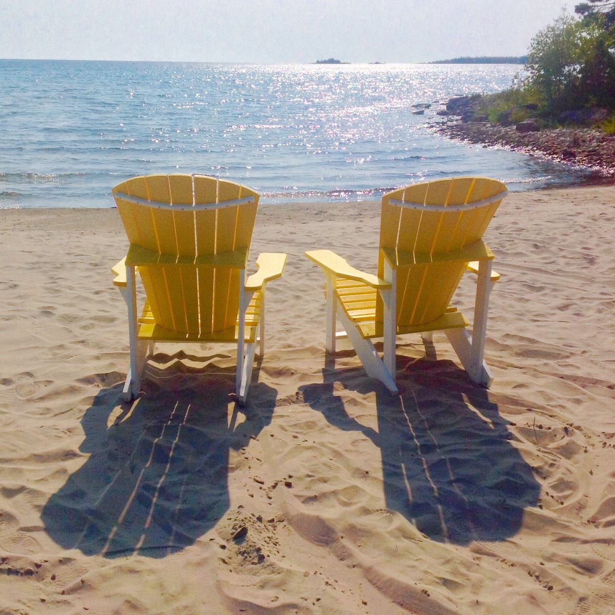 Come and stay at our beautifully renovated *all-season* beachfront cottage and enjoy a breathtaking panoramic view of Georgian Bay! You'll discover the cottage sitting atop a sand dune, right on one of the most stunning freshwater beaches in the world. This rare location hosts a private covered deck hovering over the white sand, in a beach house closer to the bay than anywhere else around! Summer guests also enjoy use of a heated salt water pool and large resort deck created by Paul Lafrance.