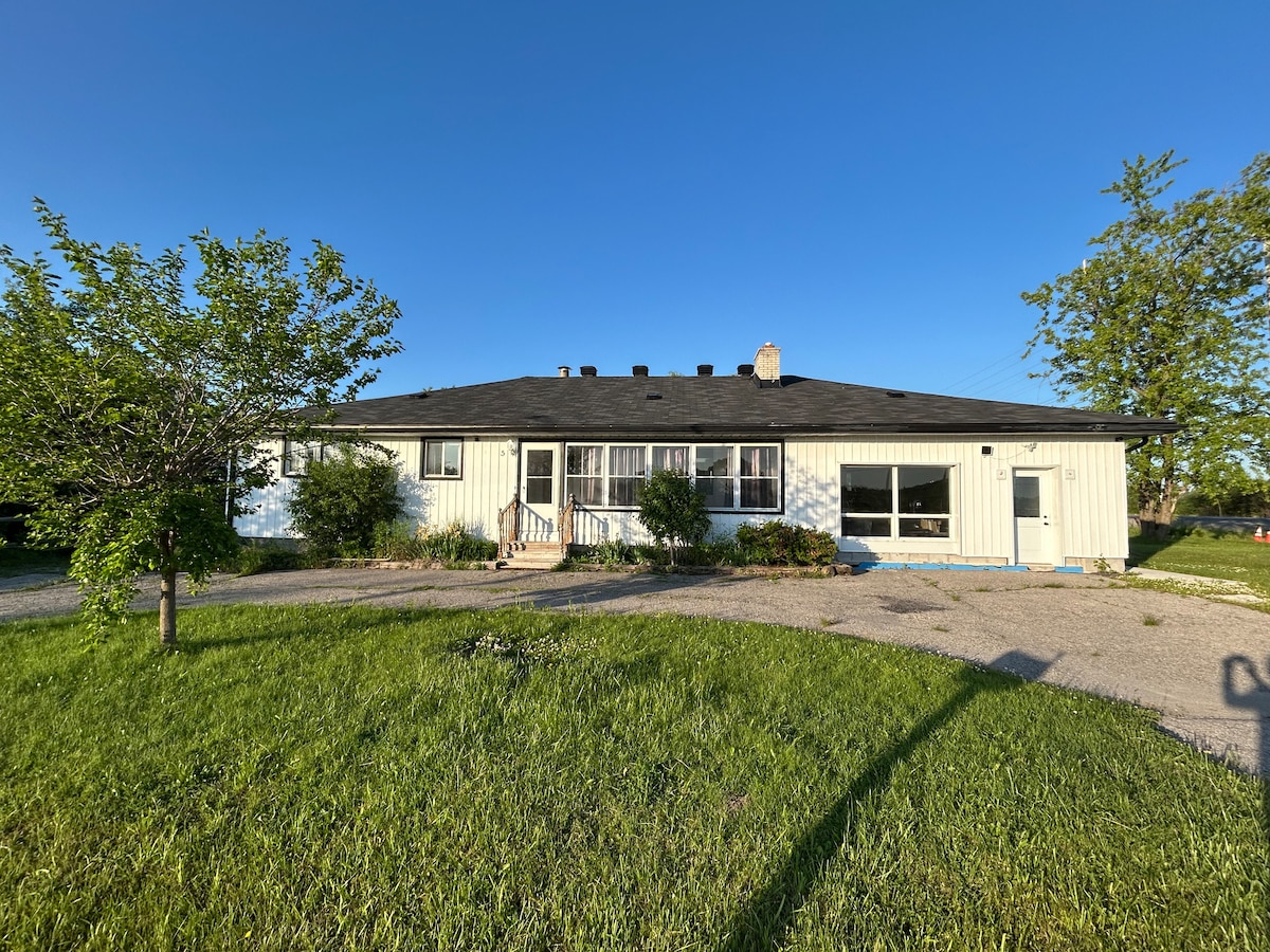 PLEASE READ! Mt. St. Louis & Horseshoe Valley at doorstep! This is a bright, large and private walk-out GUEST SUITE (basement apartment). Hot tub, patio, fire pit & secluded path in the woods to enjoy nature. Kitchen is equipped with an induction cooktop and all things necessary, even wine bottle opener:) Open concept living room/kitchen/dining room with TV & Roku. Bedroom is a work of Art: dark, mysterious and romantic! Custom Queen bed made from weathered barn wood salvaged from our property.