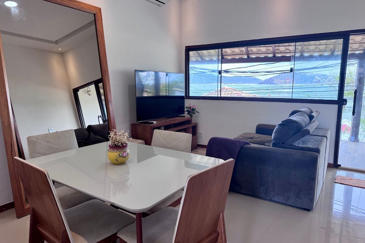 Cobertura espaçosa! Próximo das principais praias de Búzios e do Centro (Rua das Pedras). Cozinha americana em conceito aberto, sala de jantar e estar integradas com tv de tela plana de 50", cozinha externa, área gourmet (churrasqueira), terraço amplo e fresco com área social (sofá, mesas e rede). Banheiro interno e externo + 1 lavabo . 1 Quarto aconchegante: cama queen, ar condicionado e tv a cabo. Mezanino: 1 cama de casal, 2 camas de solteiro, 1 sofá cama, ar condicionado, tv e lavabo.