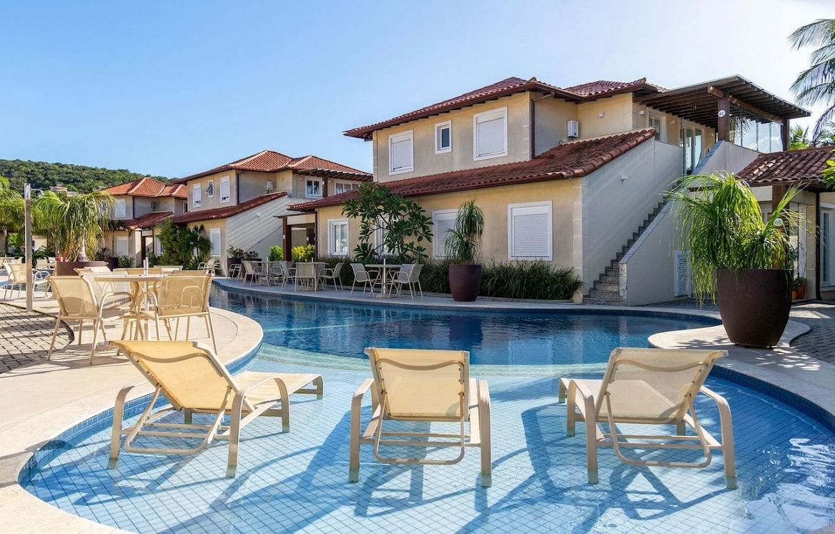 Relaxe com sua família e amigos nesta belíssima residência, localizada em condomínio seguro e tranquilo, rodeado por muita vegetação nativa, muito próxima às águas calmas da praia da Ferradura. Desfrute de todo conforto e privacidade nesse espaço com 3 belas suites, sala de 2 ambientes, integrada com cozinha, além de ampla área externa, com piscina privativa, área gourmet, solário e lindos jardins. Todas as suites e na sala possuem ar condicionado, quatro TVs smart, na sala e nas suites.