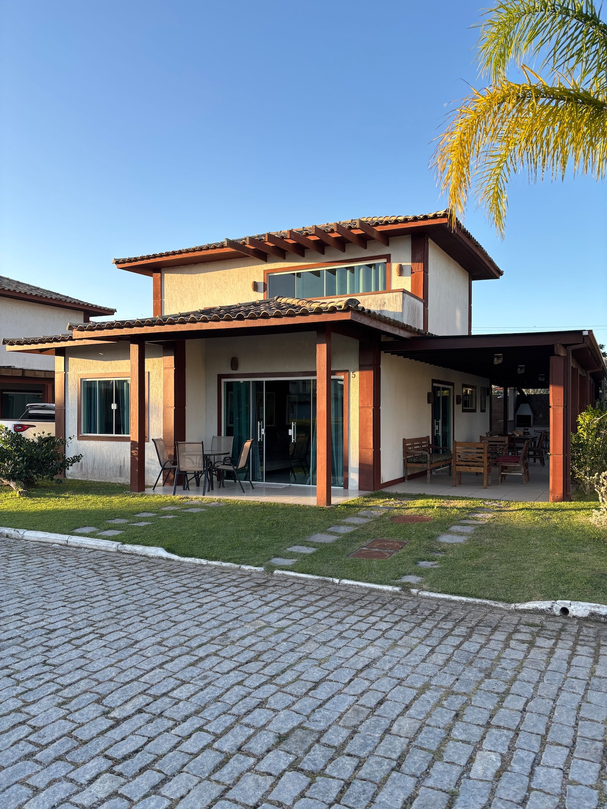 Uma típica casa de praia com todo o aconchego de um ambiente arejado, varanda com rede e churrasqueira. Localizada em condomínio seguro e agradável com piscina e área de lazer. Está a 150 metros da Praia de Manguinhos. A acomodação possui uma suíte e um quarto, os dois no segundo pavimento (com acesso exclusivo por escada). Possui ainda uma cama de solteiro localizada num quarto de passagem, também no segundo andar. Ambiente acolhedor e agradável para casais e família.