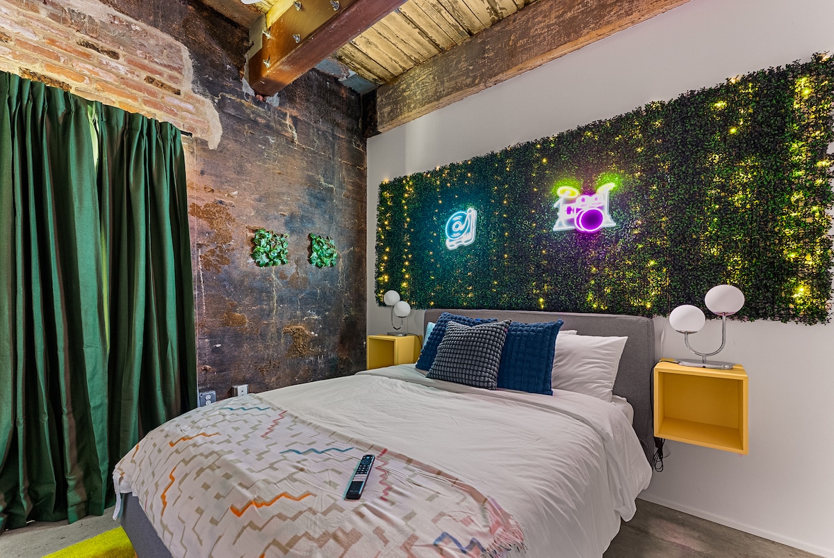 Discover the rhythm of Memphis in this upscale 2-bedroom loft just steps from Beale Street. Once a historic warehouse, now a designer retreat, it pairs exposed brick and polished concrete with warm amber, blue, and green tones. Snap photos by the neon grass wall, unwind in your private arcade or ping pong lounge, and enjoy access to a premium gym. A luxurious space to cook, connect, and create lasting memories in the heart of the city.