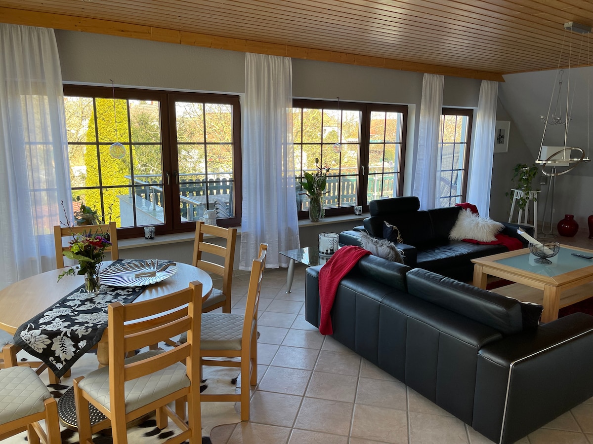 Besondere Momente erleben. Hier ist es möglich! Es erwartet Sie geräumiges Wohnen der Superklasse. Über den Dächern von Roding mit Weitblick bis in die Bergwelten des Bayerischen Waldes. Zentral gelegen. Direkt vor den Toren des Bayerischen Waldes. Regensburg 42 km entfernt. Netflix gratis für Ihre Lieblingsserien oder ihr Kinoerlebnis auf 85 Zoll Fernseher im Schlafzimmer.