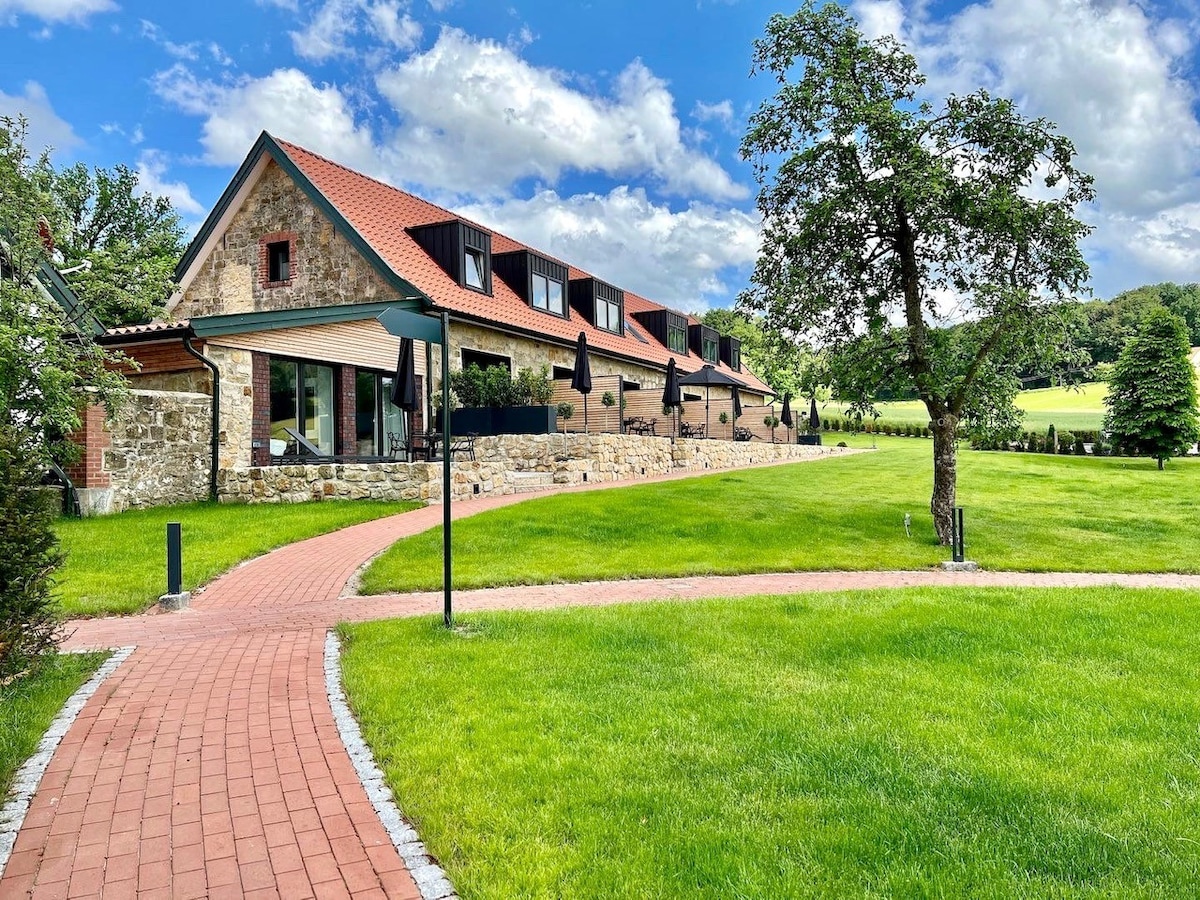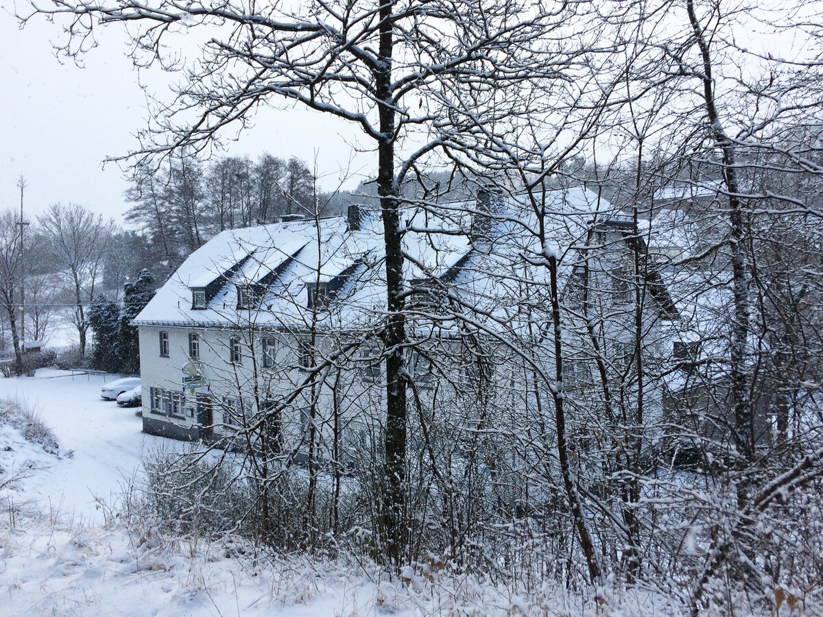 De hotelkamer, Malbec, bevindt zich in een kleine Gasstätte, boetiekhotel, op de 1e verdieping. In de tuin is het heerlijk toeven rondom de frisse vijver met zwemtrap of 's avonds bij de vuurschaal. Het restaurant serveert ontbijt en, in overleg, diner (de beste Pizza's van Duitsland!). Als je je hond goed hebt opgevoed mag je hem natuurlijk meenemen en dan lopen jullie zo de oneindige bossen in!