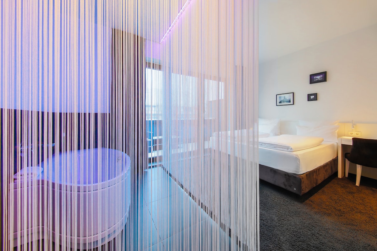 The rooms at Urban Loft Cologne are sleek, modern, and thoughtfully designed for comfort and functionality. Featuring minimalist industrial decor, each room includes a plush bed with high-quality linens, a spacious rain shower, smart TV, air conditioning, and soundproof windows. Natural light, sustainable amenities, and curated local artwork add a warm, personal touch—making every stay both relaxing and inspiring.