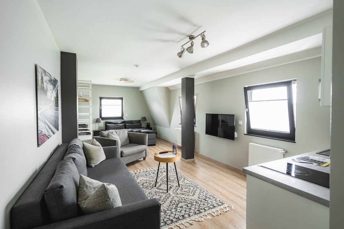 The M apartment offers a modern retreat with a king size bed and contemporary decor, designed for both relaxation and convenience. The room features a kitchenette, flat screen TV, air conditioning, soundproof windows, safe, nespresso machine, desk, seating area, wifi, Teufel speaker, hairdryer, towel heater, and DALUMA skincare.