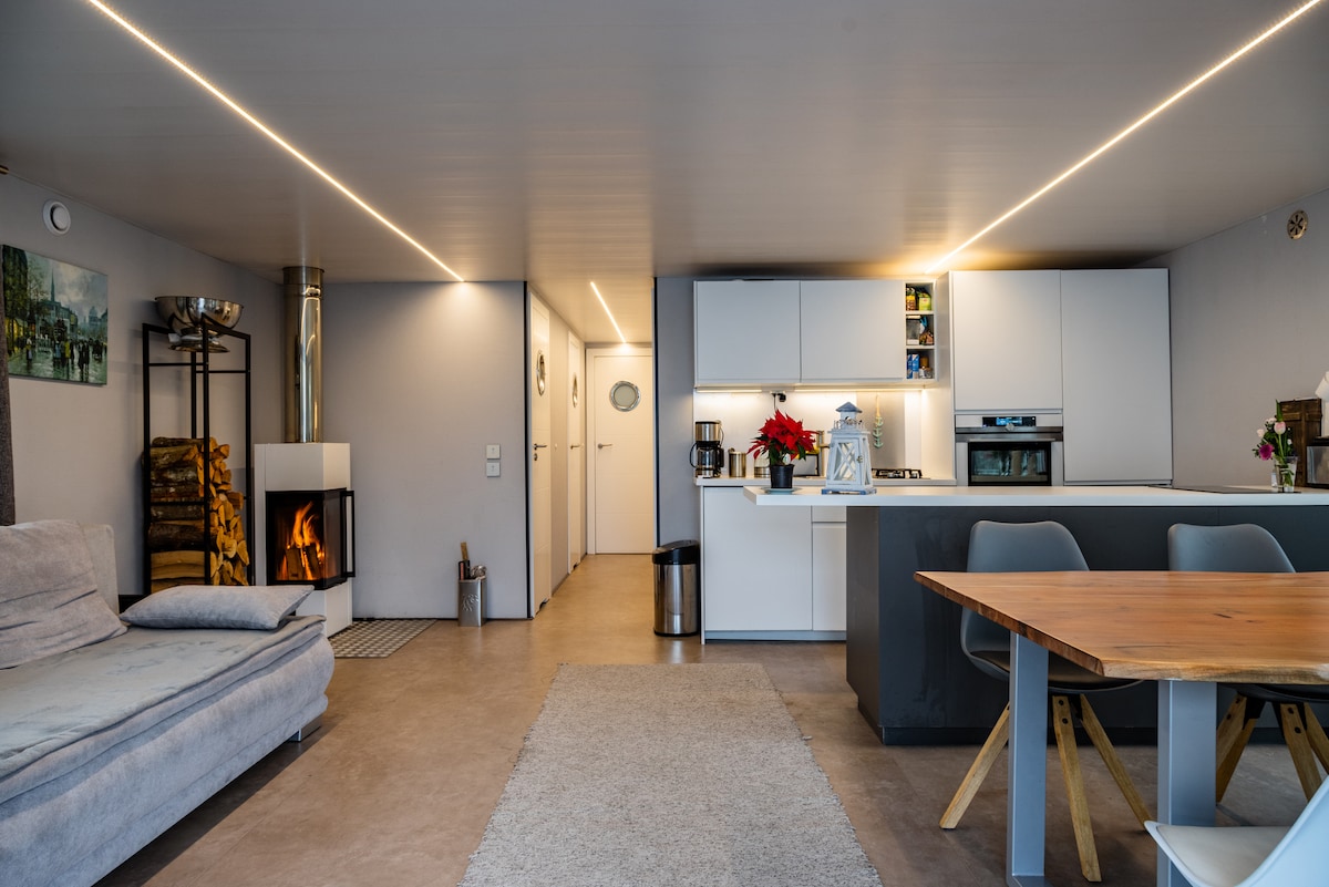 Erlebe eine unvergessliche Auszeit auf unserem exklusiven Hausboot "LEE", das sich perfekt für Paare eignet. Dieses Boot verfügt über ein gemütliches Schlafzimmer, eine Infrarotsauna und einen Wohnbereich mit Kamin, der eine besondere Wohlfühlatmosphäre schafft. Die Kochnische ist mit allem ausgestattet, was du für deinen Aufenthalt benötigst. Auf der Terrasse kannst du morgens entspannt frühstücken. Die Dachterrasse lädt zum Sonnenbaden und Entspannen ein.