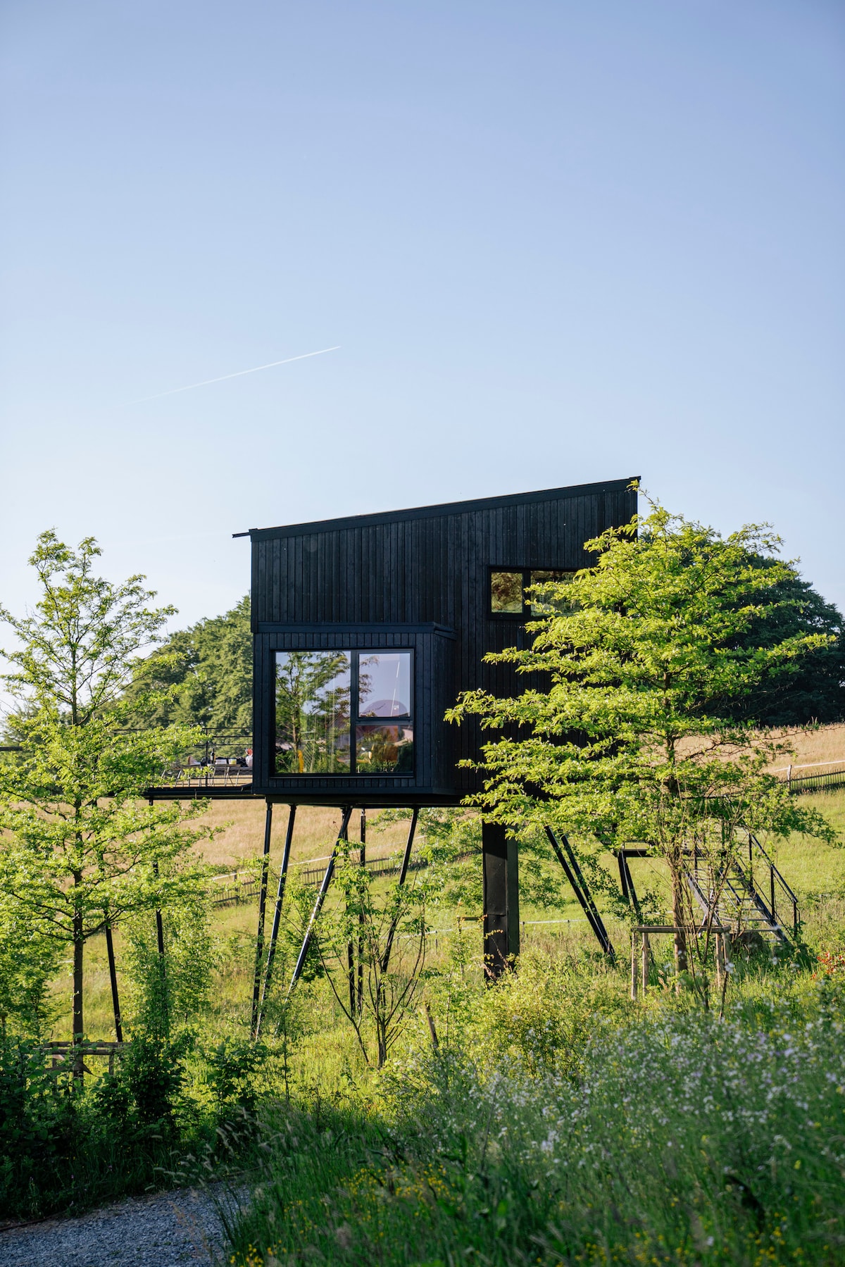 Treeangle is a stilt house located in an idyllic meadow in close proximity to our beech forest. The tree house is located at a height of 5 meters and is surrounded by a picturesque combination of forest and meadow. The large panoramic windows and spacious balcony offer a unique view of the surrounding landscape and create the perfect place to relax in the midst of nature.
