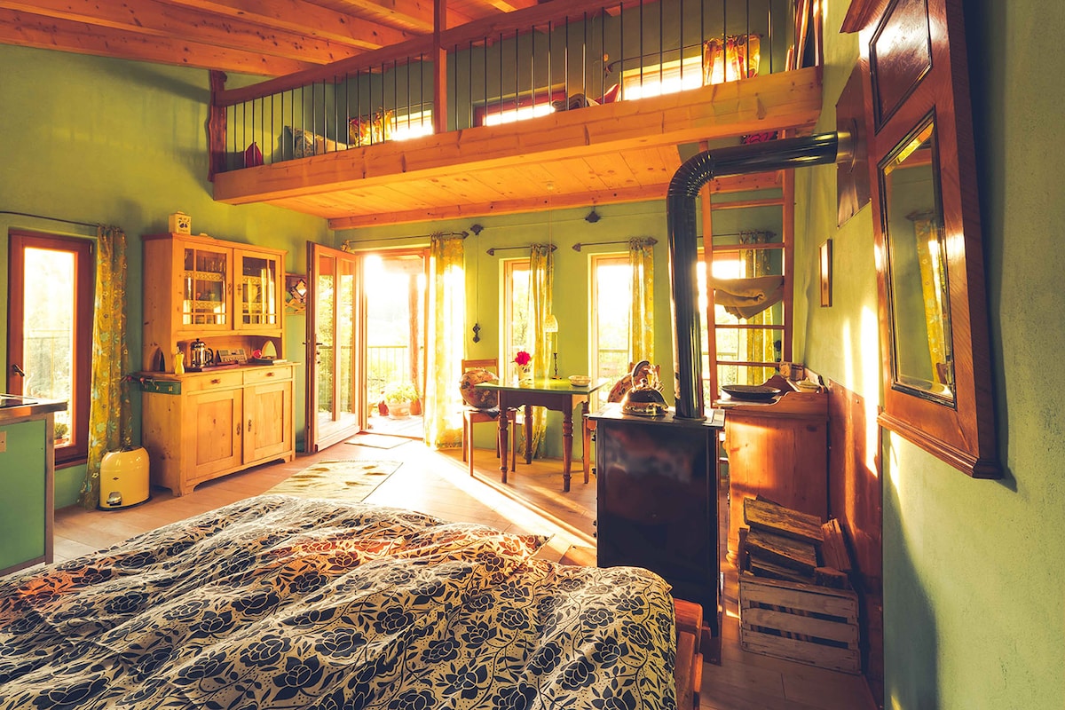 ein kleines gemütliches Baumhaus, isoliert und mit Holzofen ausgestattet. Das Bett ist 1,20m breit. Unser Kompostklo befindet sich draussen. Kochen auf dem Ofen oder Gasherd auf dem Balkon möglich. Basic Kochutensilien vorhanden. Das Luftschloss befindet sich auf einem schönen Waldgrundstück mit Trinkwasserquelle. Auch ein Naturschwimmteich gibts auf dem Gelände. Holz zum Heizen inklusive. Lagerfeuerholz kann erworben werden. Meistens ists sehr ruhig vor Ort, vor allem im Winter🙏