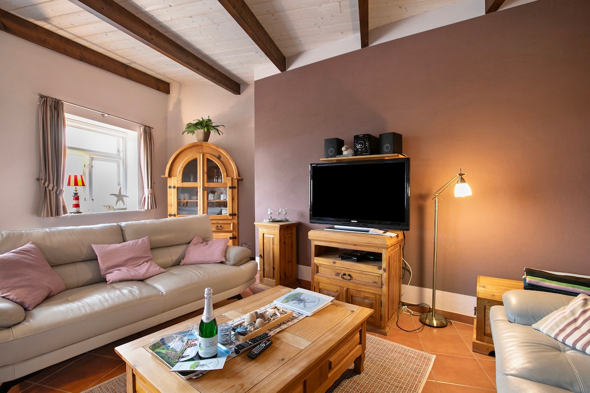 The Müllerwohnung combines traditional island charm with modern amenities. The open living area with sofa, dining space, and kitchenette is perfect for relaxing days on Pellworm. Warm colors and natural materials create a cozy atmosphere that makes you feel at home right away. The apartment offers two bedrooms, a bright bathroom, and a practical kitchen. Thanks to its quiet location in Nordermühle, it’s an ideal starting point for exploring the island on foot or by bike.