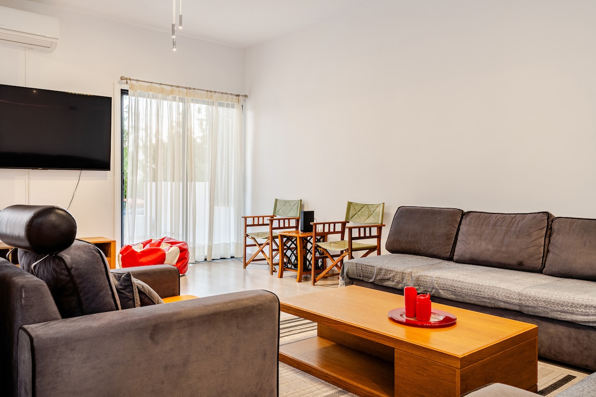 Step into laid-back Mediterranean living at our stylish ground-floor escape just 300 meters from the beach. Designed for comfort and calm, this modern space blends indoor elegance with lush outdoor charm — perfect for couples, families, or digital nomads seeking sun, style, and serenity. Enjoy your morning coffee in the private garden, take a dip in the shared pool, or stroll to the coast for a sunset swim. Whether you’re here to unwind, explore, or entertain, everything you need is right here.