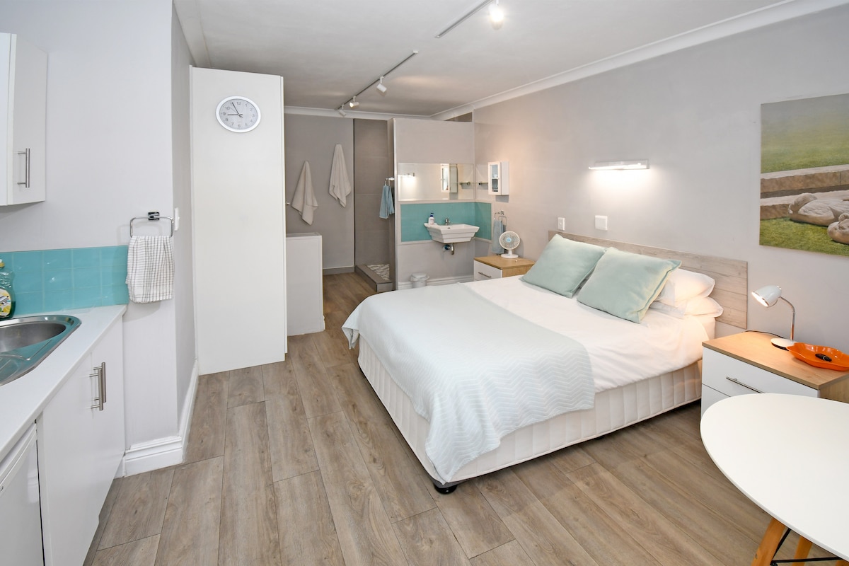 Studio apartment with kitchenette and Netflix, perfect for the corporate or leisure traveler. The apartment is meticulously cleaned and disinfected after each booking. Solar Power is provided for Lights, TV and high speed Fibre Wifi. Queen sized bed, with 400 thread count linen. The apartment is on the ground floor with communal gardens to enjoy. Coffee, Tea and sugars are available. The pool is available to be used by guests