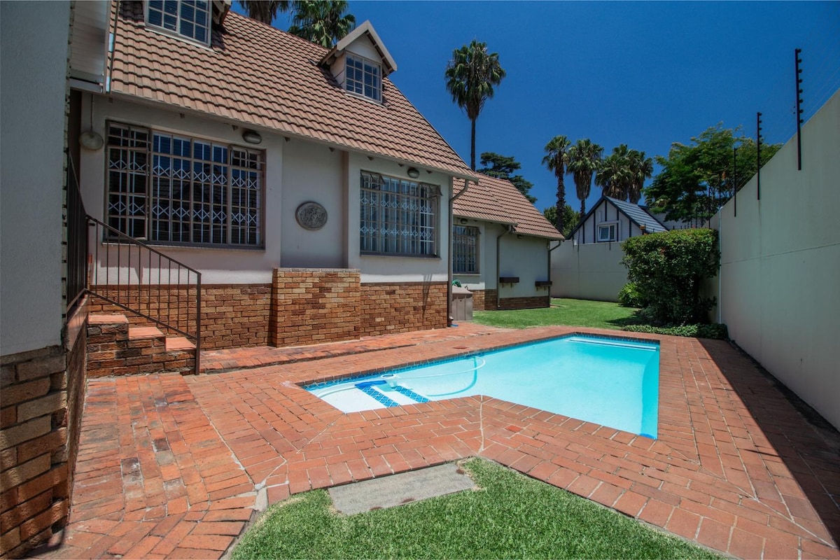 Solar powered battery inverter to escape load-shedding and forget your worries in this spacious, peaceful and centrally located place. A stone's throw from the best restaurants, shopping centres, sports facilities, and hospitals. Let the children play in the jungle gym and lush garden. Relax in the sauna and take a dip in a pool to cool down. Exercise at the gym and play pool. We look forward to welcoming you to our perfectly hidden getaway in the middle of bustling city landscapes.