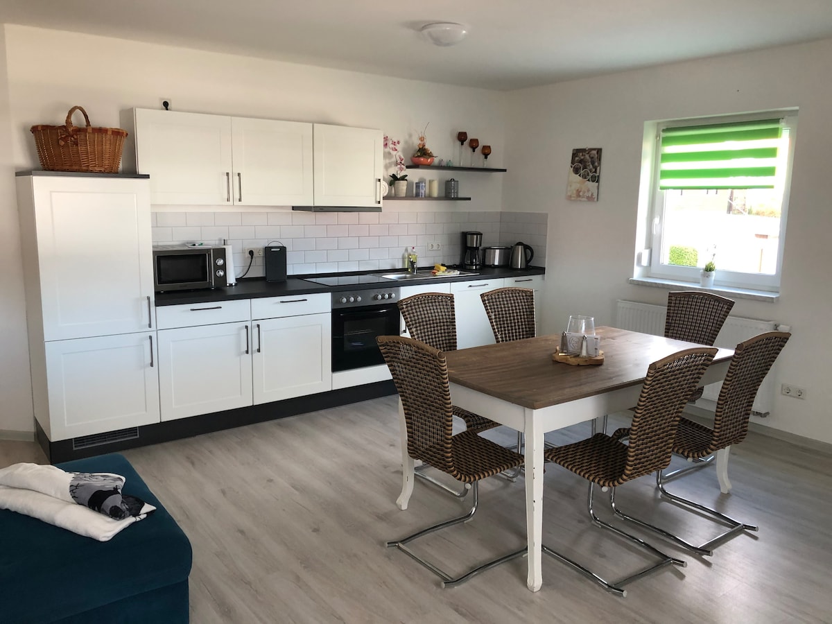 Unsere 42 m² große Ferienwohnung liegt im Dachgeschoss unseres Hauses. Sie ist sehr hell und freundlich. Ein Schlafzimmer, eine Wohnstube mit Essplatz und gemütlicher Couch, eine Küche und ein Bad mit Wanne, WC und Waschplatz stehen zur Verfügung. Außerdem gibt es eine Dachterrasse vor dem Wohnzimmer. Man kann auf dieser die Natur in aller Ruhe genießen. TV und kostenloses W-LAN sind vorhanden.