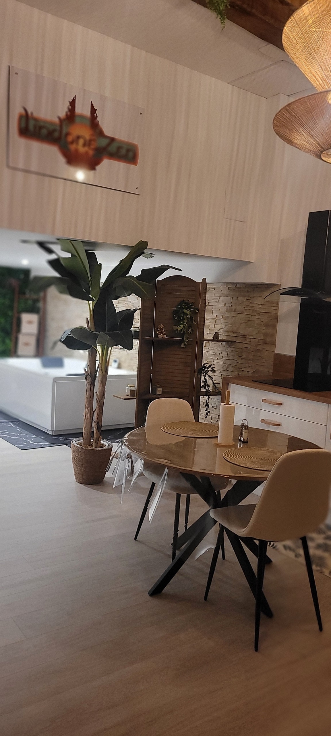 Logement à thème avec entrée autonome conçu pour la détente ! Vous trouverez une cuisine équipée, un salon et une balnéo simple d'utilisation. À l'étage, une chambre atypique vous accueillera chaleureusement avec son lit queen size, son ambiance immersive et son véritable espace massage. La salle d'eau se trouve également à l'étage. Nos amis les bêtes ne sont pas autorisés et le vol sera intolérable ! Le listing de tous les équipements est vérifié après chaque passage. A bientôt ;D