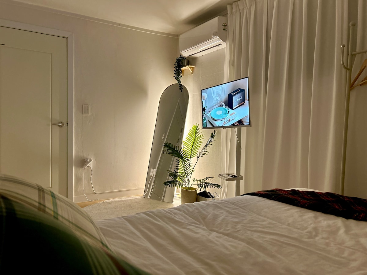 Experience the serene & cozy vibe of Under Cloud—a spacious 50m² home with two charming bedrooms, brick-finished living room, beautiful kitchen & bathroom, extra storage room, and a cozy balcony +hammock. In a quiet yet convenient area, offering easy access to Seoul’s best spots and the airport. Please click “Show more”. ☛ On foot Hongdae: 15min | Hapjeong Stn.(Line 2/6): 8min | 2 Malls: 5min ☛ By bus/subway Incheon Airport: 50min | Old Palaces: 30–40min | Myeong-dong: 30min | Gangnam: 40min