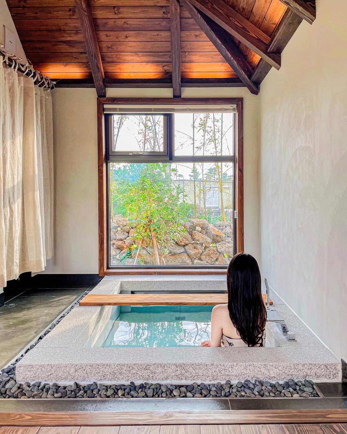 [독채 실내온수풀] 마당이 넓은시골집! -게으른오후- ▶ 4번째 작품 "제주 Su:m" 오픈기념 행사 ◀ 새롭게 선보이는 "제주 숨"의 오픈을 기념으로 특가 행사를 진행하게 되었습니다. 25%~최대 55% 할인된 금액에 예약 진행 중입니다. 본 행사는 협력업체의 지원으로 기획하게 되었으며, 예약율에 따라 조기 종료될 수 있습니다. 작았을 시절 평상에 앉아 동박새 소리를 듣고 있자면, 그날의 오후는 너무나도 게으르고 싶었습니다. 1972년 지어진 돌 담 집이 2020년 2월 . 옛 정서는 남기고 현 시대의 편안함을 접목해 아날로그 식 감성과 편안함으로 행복한 하루를 제공해 드립니다. 100평의 마당위에 시골 집, 잔디 마당, 돌 담과 파고라로 건축 된 프라이빗 한 넓은 데크에 온수풀이 설치되어 있습니다. 우천시에도 편안한 온수 풀을 이용할 수 있습니다. 집 주인이 직접 건축, 인테리어를 했답니다.