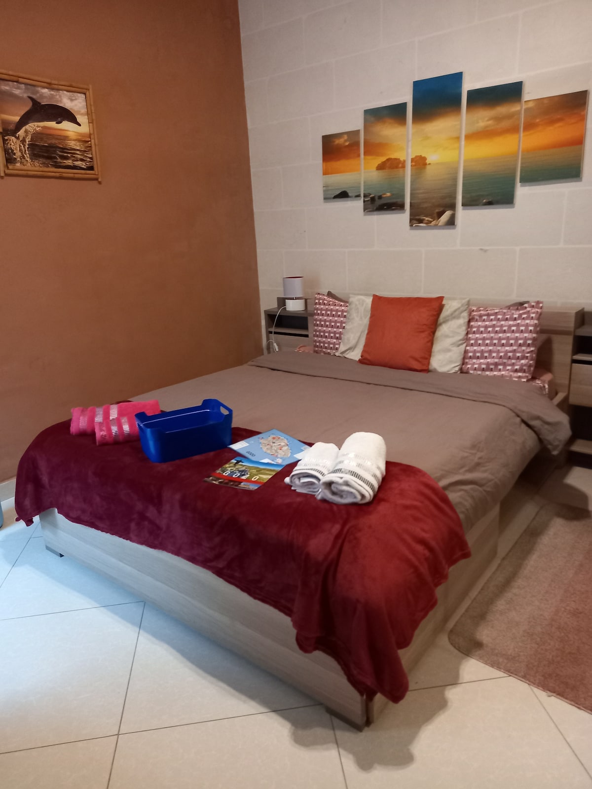 Spacious airconditioned room with own private bathroom in a ground-floor house (no stairs) situated in the picturesque seaside village of Marsaskala. The village centre with its seaside promenade, restaurants, bars and lovely bay is within 10 mins walk. Bus stop just 3 minutes walk from our house. Free parking on premises also available. This is an ideal holiday place whatever the season - whether it's Spring, Summer, Autumn or Winter.