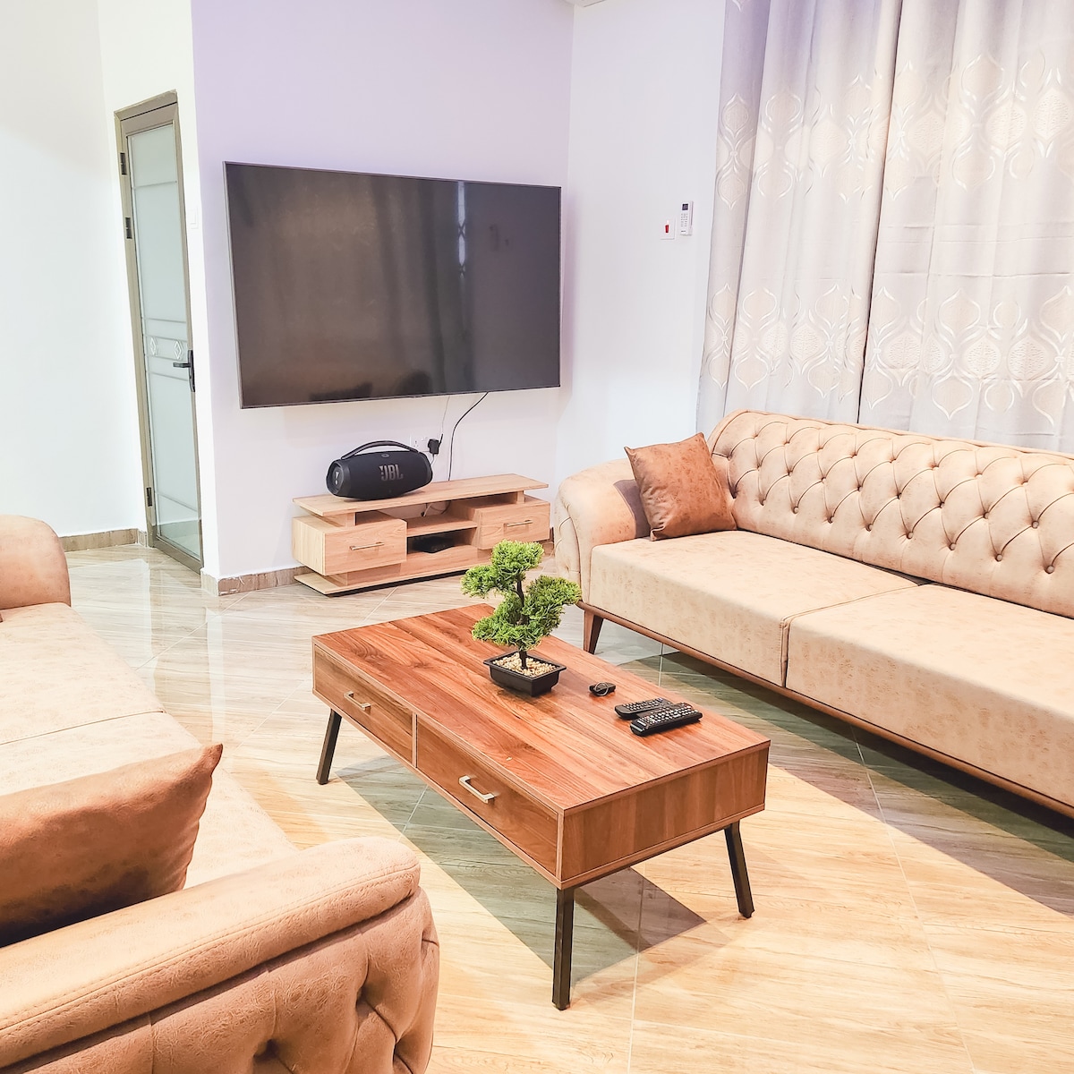 - 3 bedrooms and 2 bathrooms (1 private en-suite, 1 main) - Living Area with 55 inch Smart TV - Fully equipped kitchen (including washing machine) - Hot water - Dining Area - Private Entrance - BBQ/Grilling Area - High-speed Wi-Fi - Free Parking (up to 3-4 cars) - CCTV cameras and electric fencing for your safety - Free cleaning service when needed - Self check in with our 24/7 Caretaker *GENERATOR AVAILABLE FOR POWER CUTS Perfect for families, tourist and business travellers!