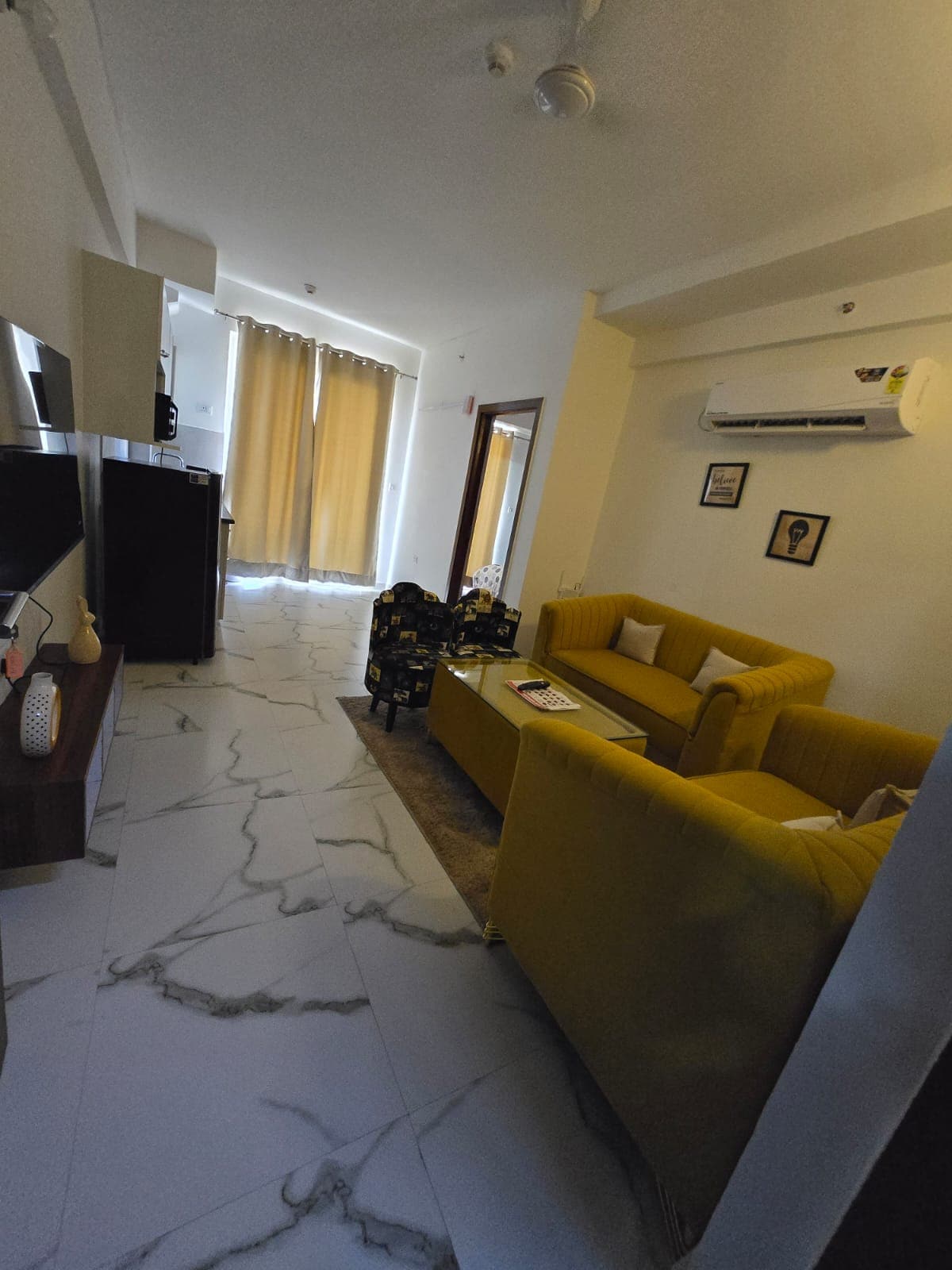 Welcome to our luxurious urban Studio, a sanctuary of style and sophistication in the vibrant heart of the Gurgaon. A standout feature of our loft is specialty Black color scheme, which adds a touch of elegance and drama to space, making your stay comfortable & stunning. As you step into our elegantly furnished Studio, you’ll be greeted by sight of our plush black recliners. These two luxurious recliners are the centerpiece, offering a perfect blend of contemporary design & exceptional comfort.