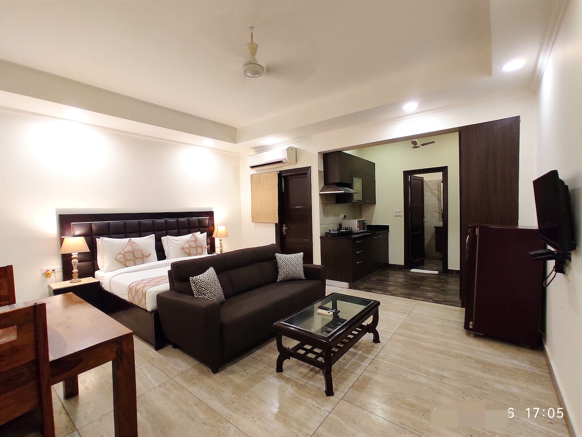 Premium 1BHK Service Apartment in Sector 43, Gurgaon with AC in living room & bedroom, plus a kitchenette with induction, microwave & cutlery. In a posh area, walking distance to Gold Souk Mall & Shalom Hills School, 2.2 km from Millennium City Centre Metro & 2.1 km from Fortis Hospital. Foreign guests are welcome. Early check-in will be subject to availability and chargeable Rs.500 as well as late checkout will also be the same with ₹500 added for every 3 hrs thereafter.
