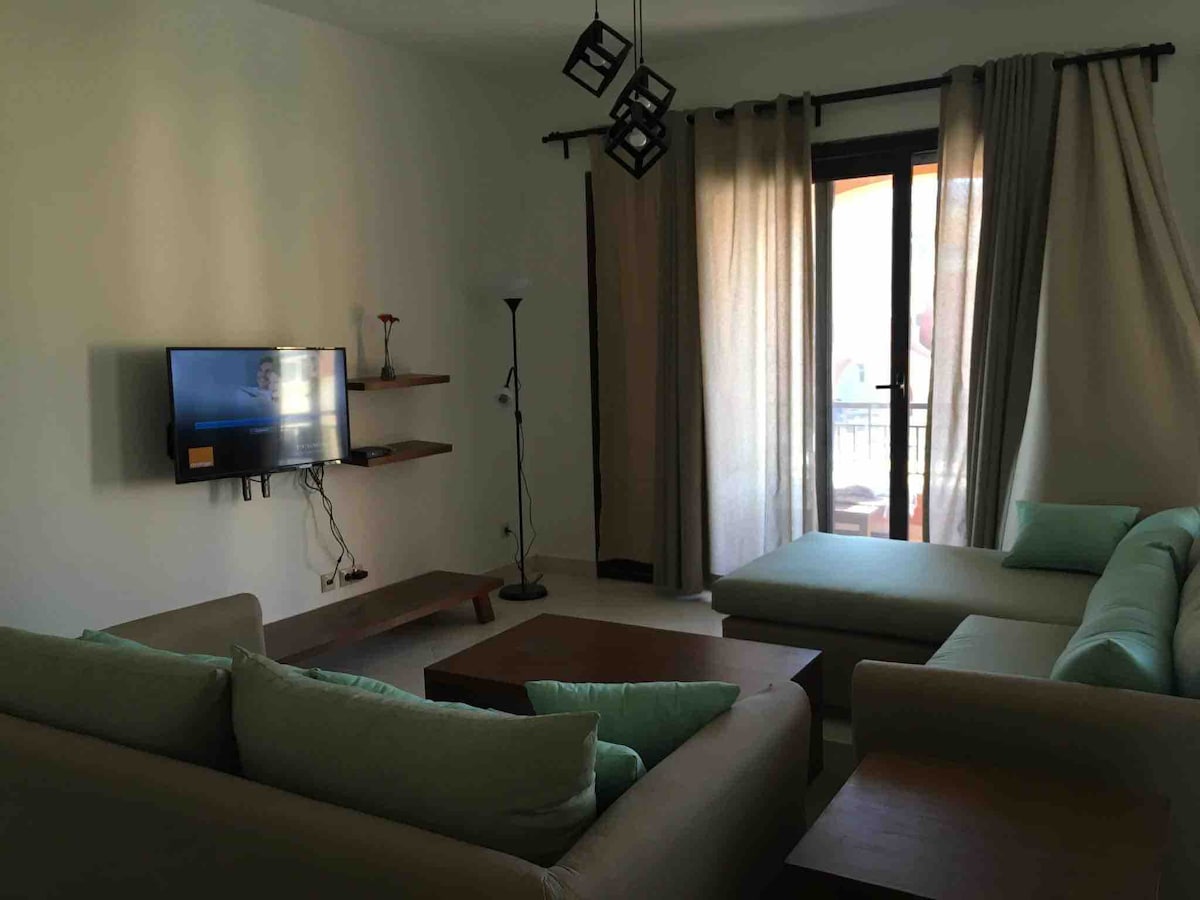 Steps to the beautiful Marina, enjoy the walk and all types of restaurants and cafés. The apartment has two queen size beds, fully equipped kitchen and big bathroom. A family of two adults and two kids will be enjoying the beach and swimming pools. You can use Marassi golf cars to move around so you don't need your car!