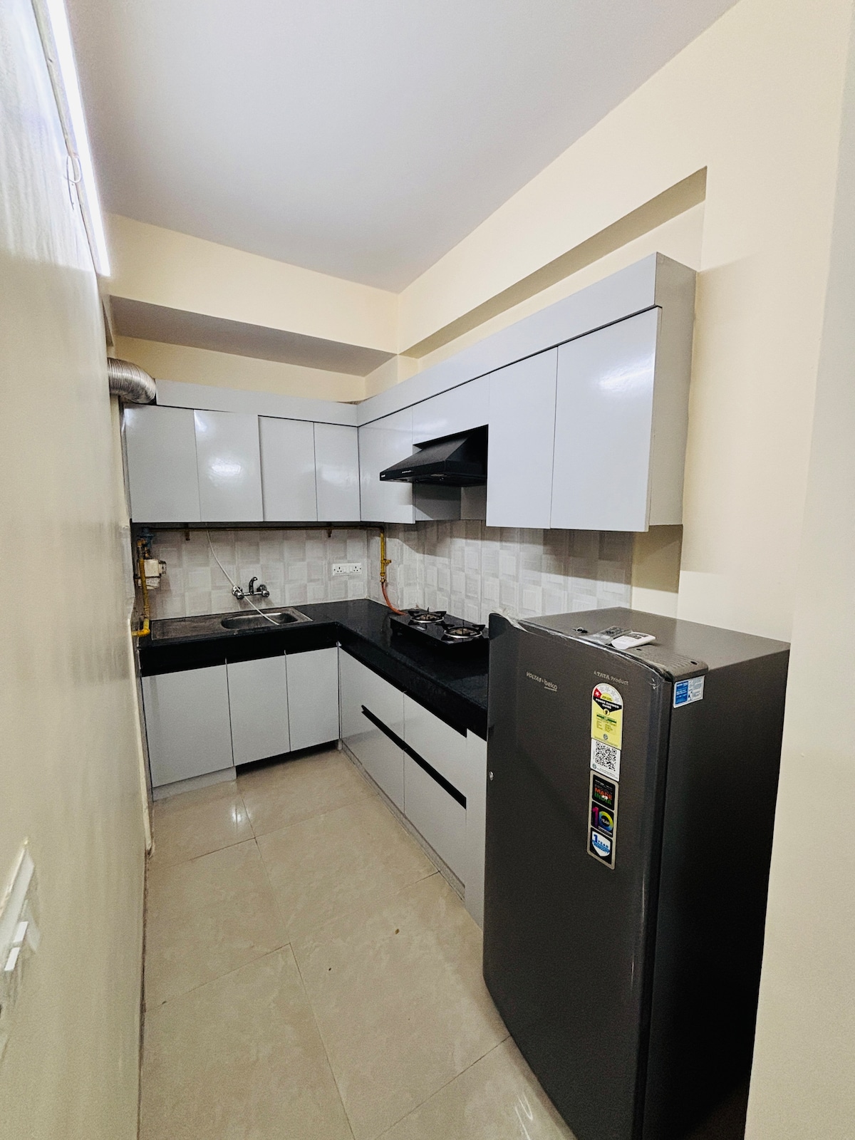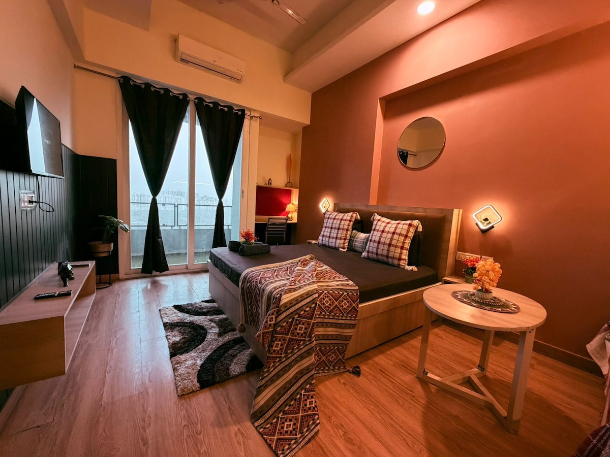Our newly constructed 2 BHK apartment blends modern comfort with natural charm. The space features 2 serene bedroom with a queen-size beds, a spacious living room, a well equipped kitchen, 2 bathrooms: one attached to the master bedroom and another accessible from the living room and second bedroom and L- shaped balcony offering great view of the city. The property is located near a premium mall in Noida! This well-situated location offers you the convenience of shops, cafes, and entertainment.