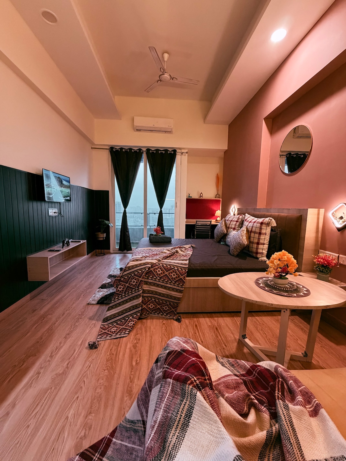 Welcome to a thoughtfully designed air-conditioned studio apartment offering comfort, style & privacy in a premium residential society in Indirapuram. With elegant décor, a cozy ambience, a 55” smart TV with all prominent OTT like Netflix, Prime, Hotstar etc subscribed, along with an iron, hair dryer & a functional kitchen, the space is ideal for work trips, short stays, or longer getaways. Quiet, secure, and well connected, this studio promises a comfortable stay you’ll be happy to return to.