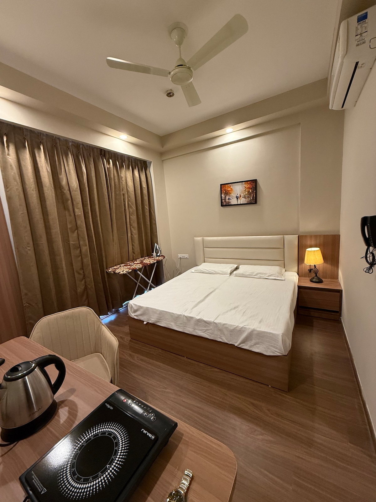 Kick back & relax in this calm & luxurious studio with the warmth of home & the vibe of a high-end hotel. Furnished with a plush Queen-size bed & modern décor. Amenities: 24/7 Grocery Store Modern Kitchenette High-Speed WiFi & TV Secure Parking outside tower but 24/7 Secured The first 2 floors has commercial shops, offering: Laundry Services Salon Café Medical Store Easy access to the India Expo Mart, Buddh International Circuit. Perfect for couples, solo travellers, or business partners.