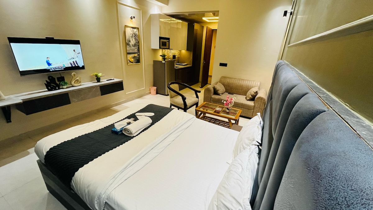 "Not Just a Stay, A Story" In the heart of Noida, Haven Hideout Studios welcomes you to our second exclusive listing. Just steps from Sector 50 Metro, this thoughtfully designed studio blends homely comfort with modern luxury. Enjoy a fully equipped kitchen, cozy lounge, scenic balcony, and all essentials for a relaxed stay. Perfect for families, couples, or solo travelers seeking privacy, convenience, and a touch of elegance in a prime location near malls, eateries, and city attractions.