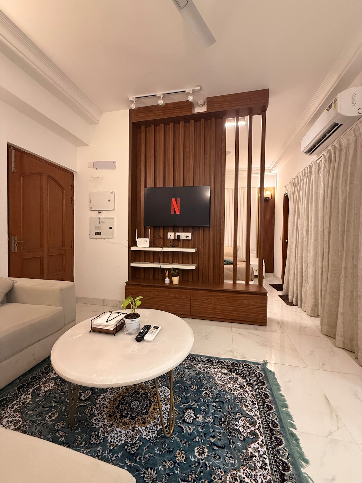 Our newly constructed 2 BHK apartment blends modern comfort with natural charm. The space features 2 serene bedroom with a queen-size beds, a spacious living room, a well equipped kitchen, 2 bathrooms: one attached to the master bedroom and another accessible from the living room and second bedroom and L- shaped balcony offering great view of the city. The property is located near a premium mall in Noida! This well-situated location offers you the convenience of shops, cafes, and entertainment.