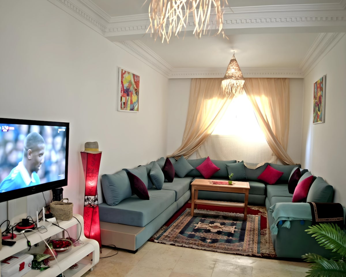 profitez de l'élégance du charme de cet appartement magnifiquement décoré avec beaucoup de goût et d'un style original l'appartement est situé dans la maison familiale de l'hôte,dans quartier calme et familier et proche à la fois de la plage et de l'ancienne médina et à distance de marche de restaurants et boutiques locales. notre appartement a été soigneusement organisé pour refléter le style locale et offrir un confort optimal aux voyageurs.