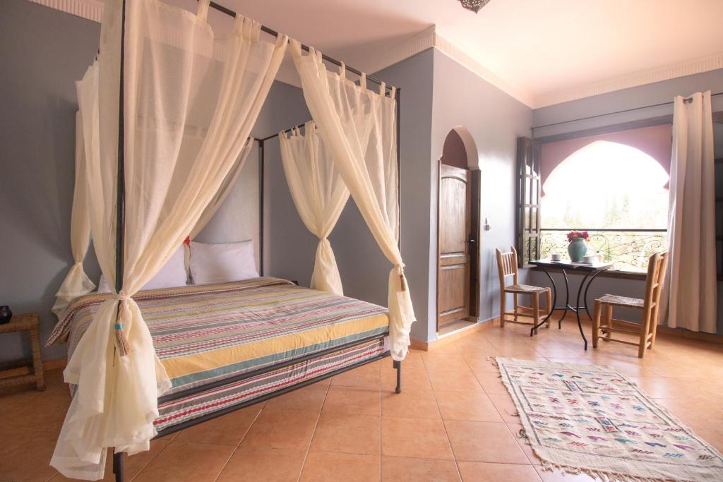 Marion et Saïd sont deux écrivains, également kick boxeurs et pour l'une, psychologue et psychothérapeute et pour l’autre ancien directeur d’un centre socio-culturel. Ils ont construit cette maison de plain pied de 600 m2 sur un terrain de 25 000 m2 au milieu d'une forêt d'arganiers. L'habitation la plus proche est à 500 m. L'aéroport de Mogador est à 6 km et Essaouira à 23 km. La maison est composée de 2 chambres et 4 suites de 45, 55, 70 et 90 m2, d'un salon de 110m2 (6m de hauteur). a/ La chambre « CURCUMA » de 30 m2 avec cheminée et Salle de Bain (SdB = Toilette + Lavabo + baignoire) (idéale pour 2 adultes + un bébé) b/ La chambre « MOKA » de 35 m2 avec cheminée, coin salon et SdB ( idéale pour 2 adultes + 1 enfant), avec climatisation. c/ La suite « SAFRANE » de 45 m2 avec cheminée, coin salon et SdB (2 adultes + 2 enfants+ 1 bébé) d/ La suite « ZARAK » de 55 m2 avec un espace salon et sa cheminée + une terrasse privative avec banquettes et table + SdB (2 adultes + 2 enfants) ou 4 copains. e/ La suite « BLED » de 70 m2 avec 2 espaces salons + SdB plus ( 4 adultes + 1 enfant + 1 bébé) avec climatisation. f/ La suite « AZUR » de 90 m2 avec 2 chambes + 2 SdB + 1 salon (6 adultes) avec climatisation. Un patio, une piscine (non disponible durant la saison hivernale), un hammam de 12 m2, un ring de boxe et sacs de frappe en plein air, une bibliothèque, jardins et terrasses. La cuisine, traditionnelle marocaine, est concoctée avec des produits bio. 5% des bénéfices net sont reversés à l'association de développement local Ida o blal ... Pour venir chez nous il faut être véhiculé. Nous vous déconseillons les taxis qui n'aiment pas prendre la piste. Depuis janvier 2019, l'accès est direct et à 13mn de l'aéroport (30mn d'Essaouira). Il faut compter 6km de piste non tamisée. Avec notre dacia Logan, nous roulons nous-mêmes en moyenne à 50km/h. Il faut compter 300 à 450 dirhams par jour selon la saison pour une voiture de location type Dacia mais il paraît que c’est mieux de louer à l’aéroport de Marrakech ou d'Essaouira dans les agences internationales de location par internet, à vous de voir. La maison est construite sur le haut d'une colline. La vue panoramique de 360 ° est époustouflante sur une quinzaine de km. Lieu tout à fait propice pour un long séjour autour de la lecture, l'écriture, la méditation ou tout simplement du farniente autour de la piscine et de sa cascade. Pour la pension complète, en plus des petits déjeuners qui sont déjà compris dans le tarif des chambres (composés de pain fait maison, beurre confitures, jus d'orange frais et boisson chaude) nous vous proposons un déjeuner et un dîner, avec, selon la saison, des légumes bio de notre jardin (notre gîte est sur un terrain de 25 000 m2), comprenant des plats traditionnels marocains (une entrée, un plat et un dessert avec une bouteille d'eau minérale et un café ou thé aux herbes aromatiques de notre jardin, au choix) à : 20 euros par adulte les 2 repas midi (8 euros) et soir (12 euros) 14 euros pour les enfants de 5 à 13 ans (midi 6 euros et soir 8 euros) Gratuit pour les 4 ans et moins. Possibilité de lessive pour 5 euros la machine. La piscine est gratuite mais le hammam est payant. Pour information les compagnies TRANSAVIA (groupe Air France / KLM) et RAYNAIR desserviront maintenant Essaouira depuis Orly, Bruxelles et Marseille (à partir du 1er mars) Nous restons à votre disposition pour d'autres infos ! Marion&Saïd