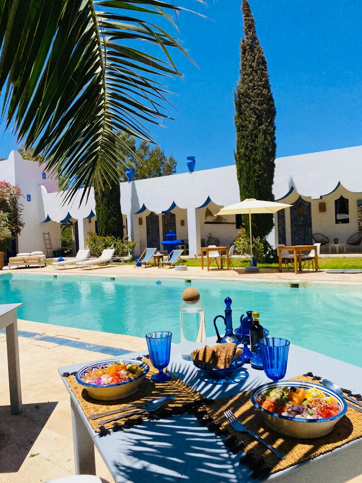 Pour la pension complète, en plus des petits déjeuners qui sont déjà compris dans le tarif des chambres (composés de pain fait maison, beurre confitures, jus d'orange frais et boisson chaude) nous vous proposons un déjeuner et un dîner, avec, selon la saison, des légumes bio de notre jardin (notre gîte est sur un terrain de 25 000 m2), comprenant des plats traditionnels marocains (une entrée, un plat et un dessert avec une bouteille d'eau minérale et un café ou thé aux herbes aromatiques de notre jardin, au choix) à :