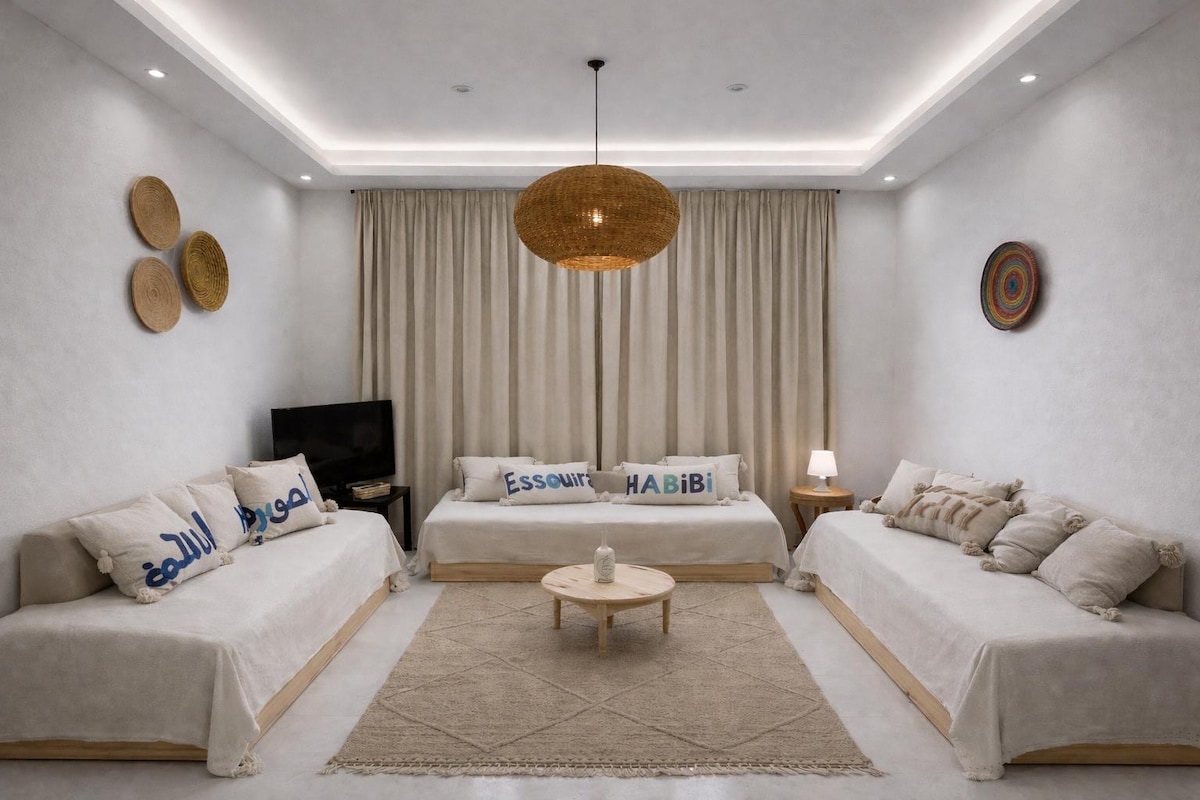 Villa Lalla Malika, une magnifique villa de 130 mètres carré, dans un terrain de 500 mètres carrés , située au ghazoua (10min vers le centre ville d'Essaouira en 🚘) -Piscine privé 4/9 mètres, 160cm de profondeur - 3 chambres avec leurs salles de bain - 1 salon - Cuisine américaine bien équipée (réfrigérateur, Lave vaisselle, four, cafetière expresso, Moulinex,lave vaisselle..) - Wi-Fi 📶 - Place pour 2 voitures - Petite terrasse en plein air